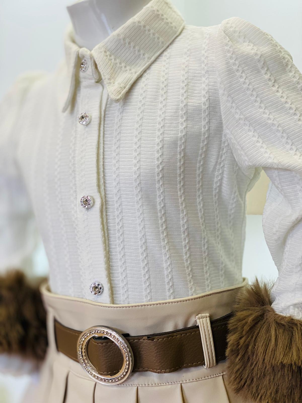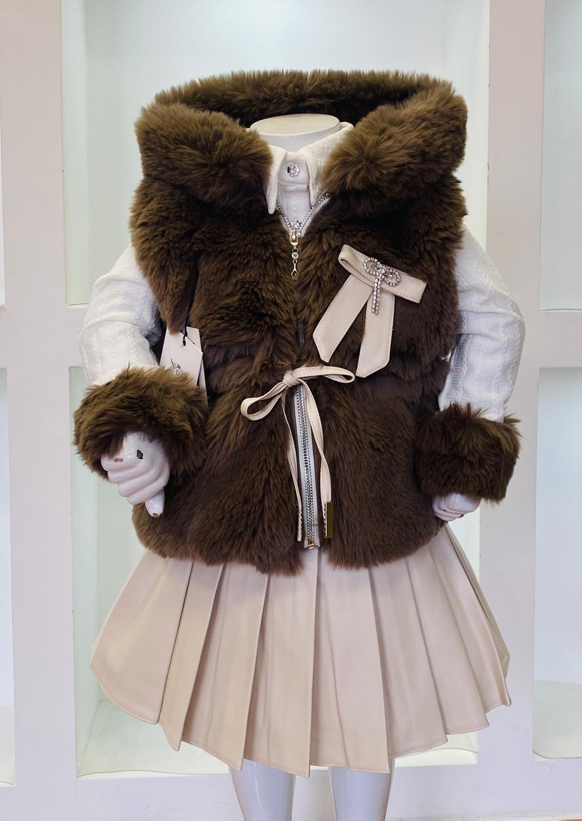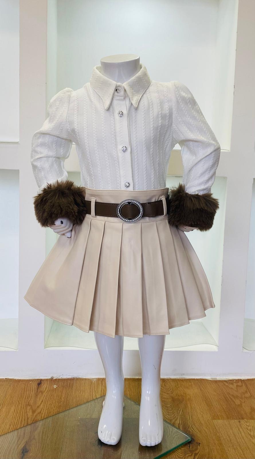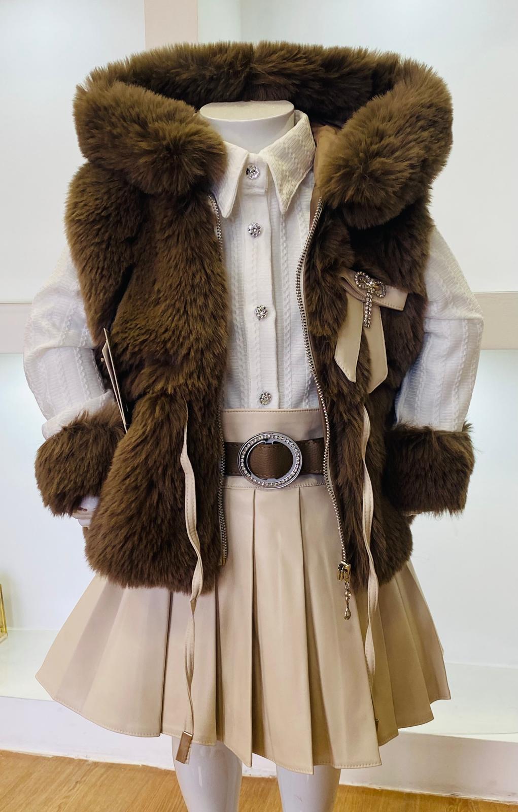 سترة فرو بدون اكمام مع تنورة وبلوزة
